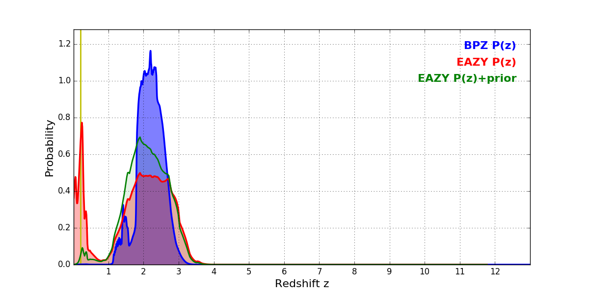 In P(z) plots: Yellow lines mark the cluster redshift z = 0.203,