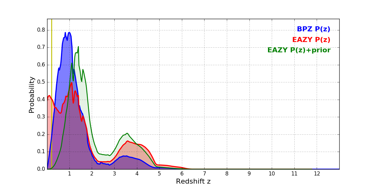 In P(z) plots: Yellow lines mark the cluster redshift z = 0.203,