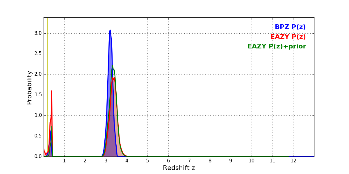 In P(z) plots: Yellow lines mark the cluster redshift z = 0.203,