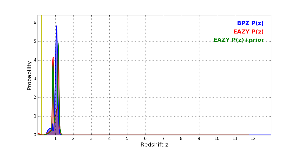 In P(z) plots: Yellow lines mark the cluster redshift z = 0.203,