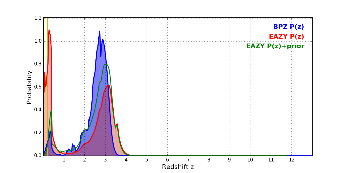 In P(z) plots: Yellow lines mark the cluster redshift z = 0.203,