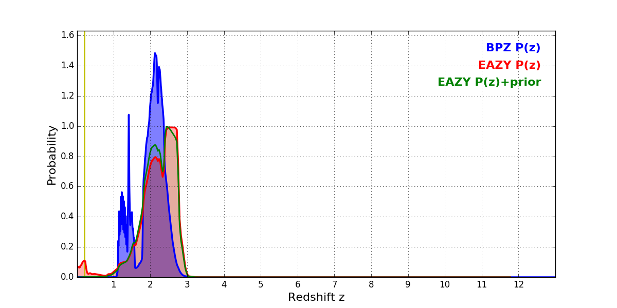 In P(z) plots: Yellow lines mark the cluster redshift z = 0.203,