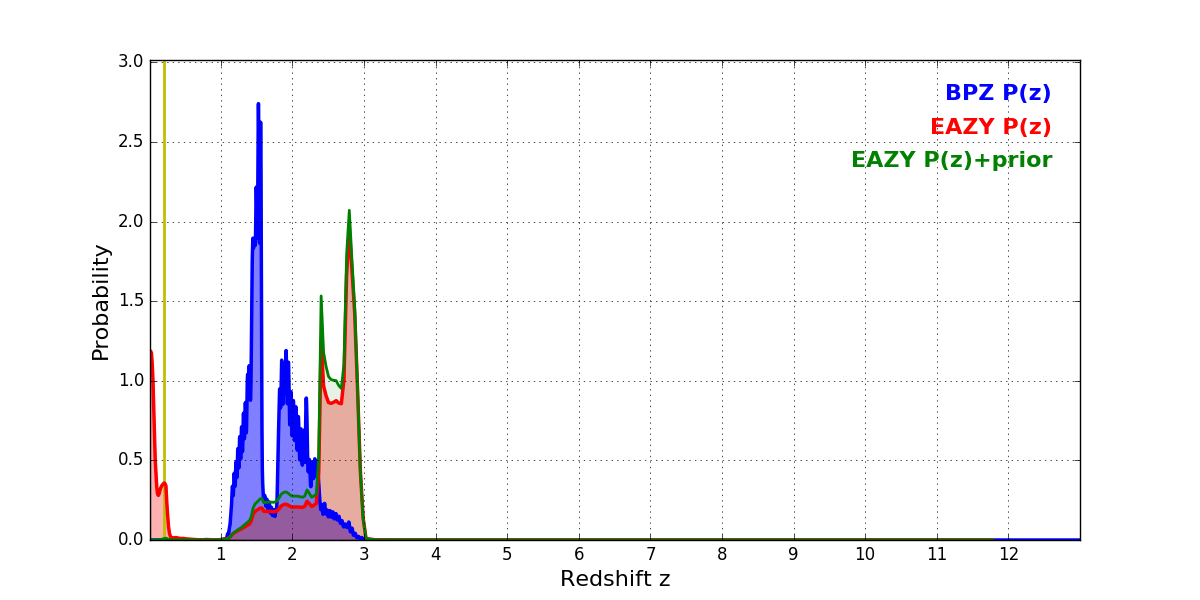 In P(z) plots: Yellow lines mark the cluster redshift z = 0.203,