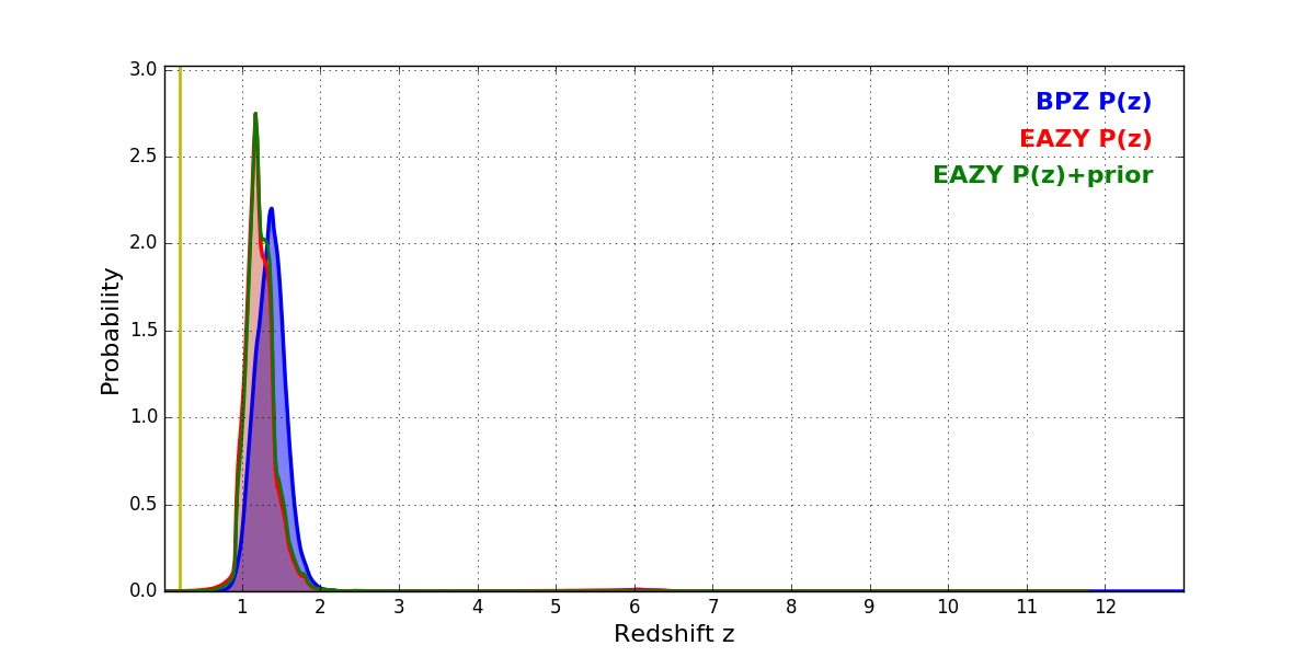 In P(z) plots: Yellow lines mark the cluster redshift z = 0.203,
