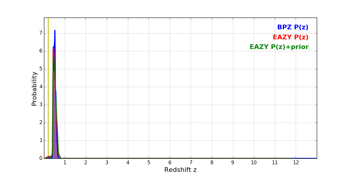In P(z) plots: Yellow lines mark the cluster redshift z = 0.203,