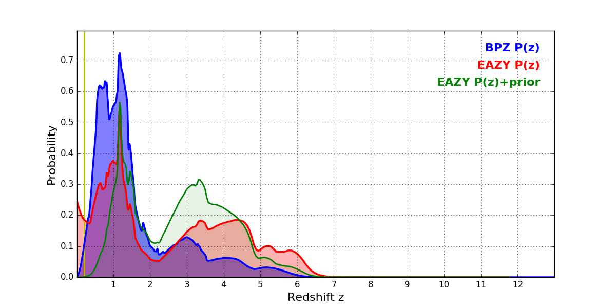 In P(z) plots: Yellow lines mark the cluster redshift z = 0.203,