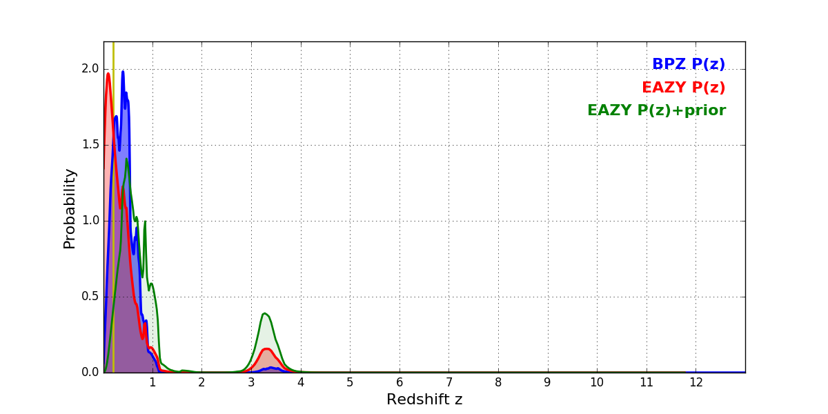 In P(z) plots: Yellow lines mark the cluster redshift z = 0.203,