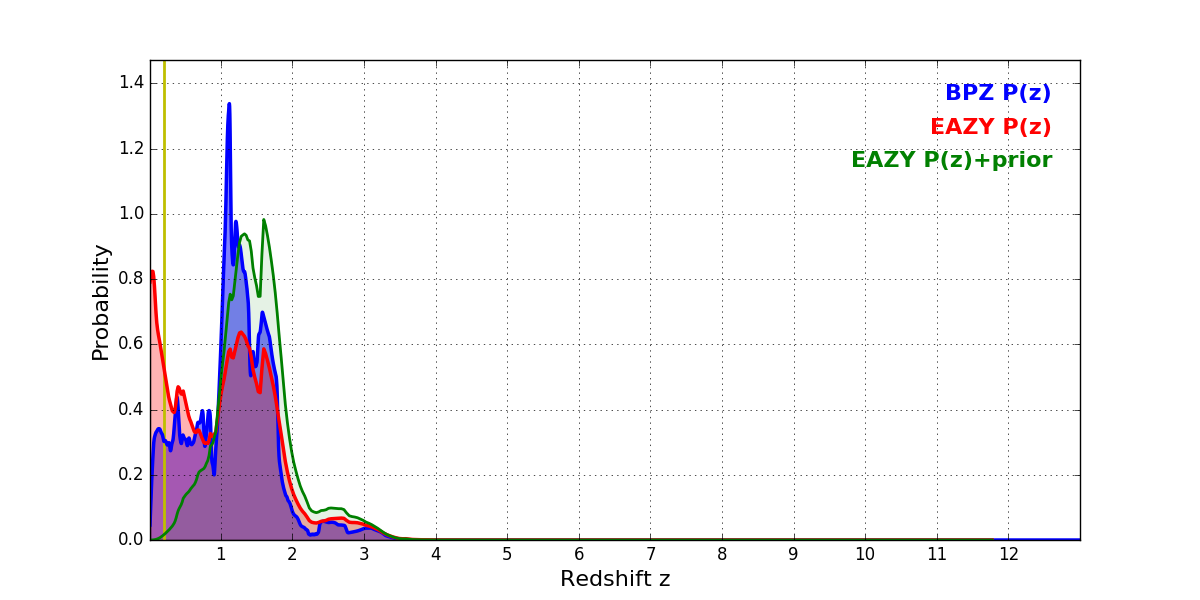 In P(z) plots: Yellow lines mark the cluster redshift z = 0.203,