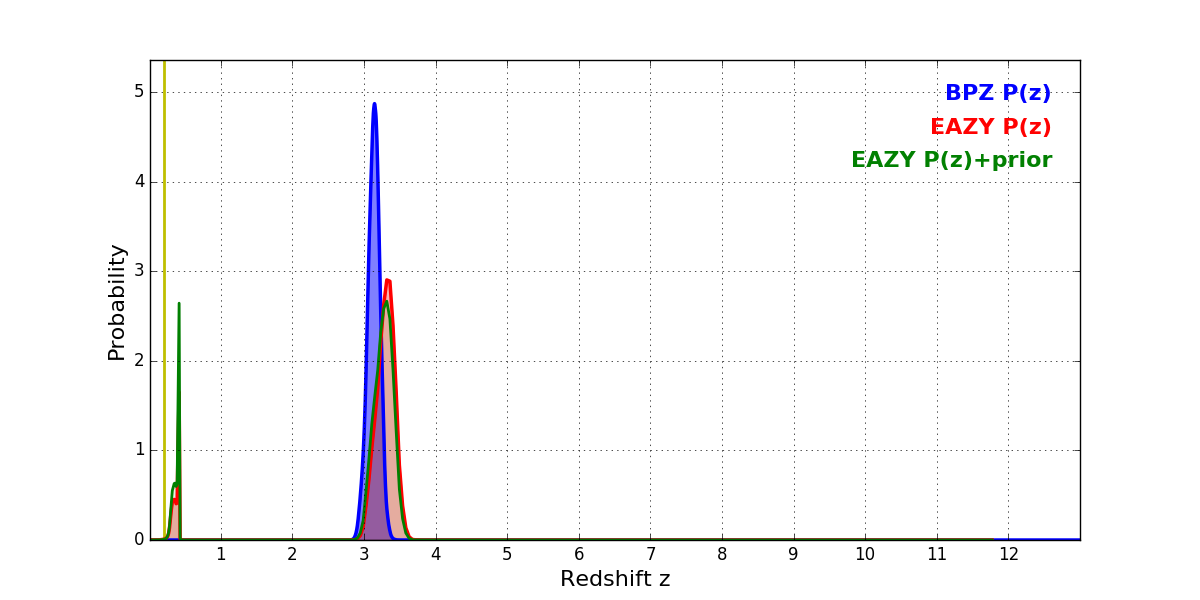 In P(z) plots: Yellow lines mark the cluster redshift z = 0.203,