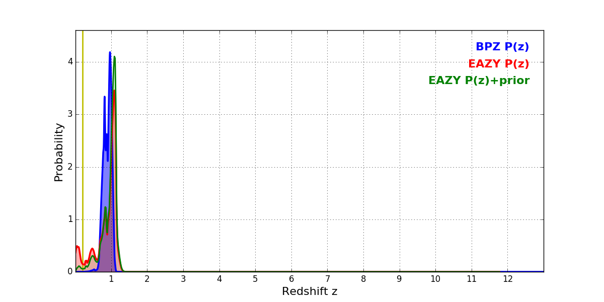 In P(z) plots: Yellow lines mark the cluster redshift z = 0.203,