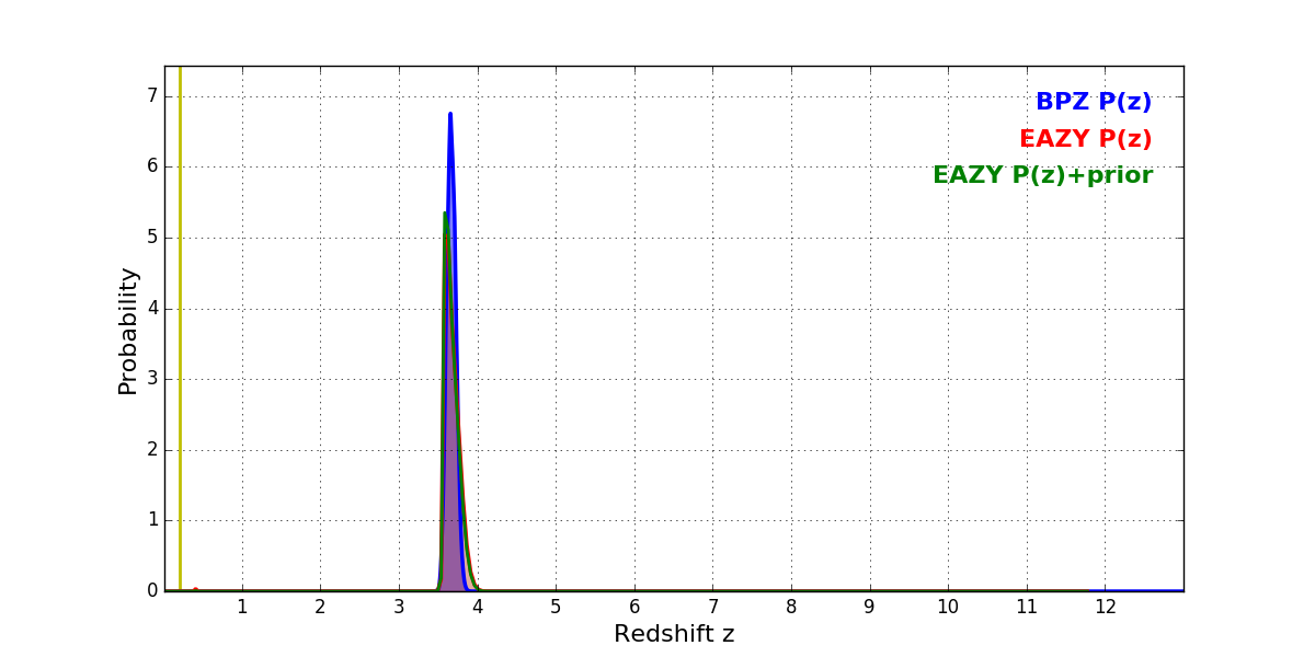In P(z) plots: Yellow lines mark the cluster redshift z = 0.203,