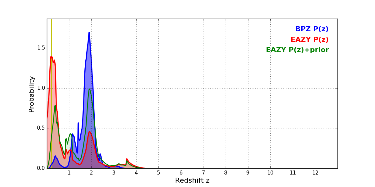 In P(z) plots: Yellow lines mark the cluster redshift z = 0.203,