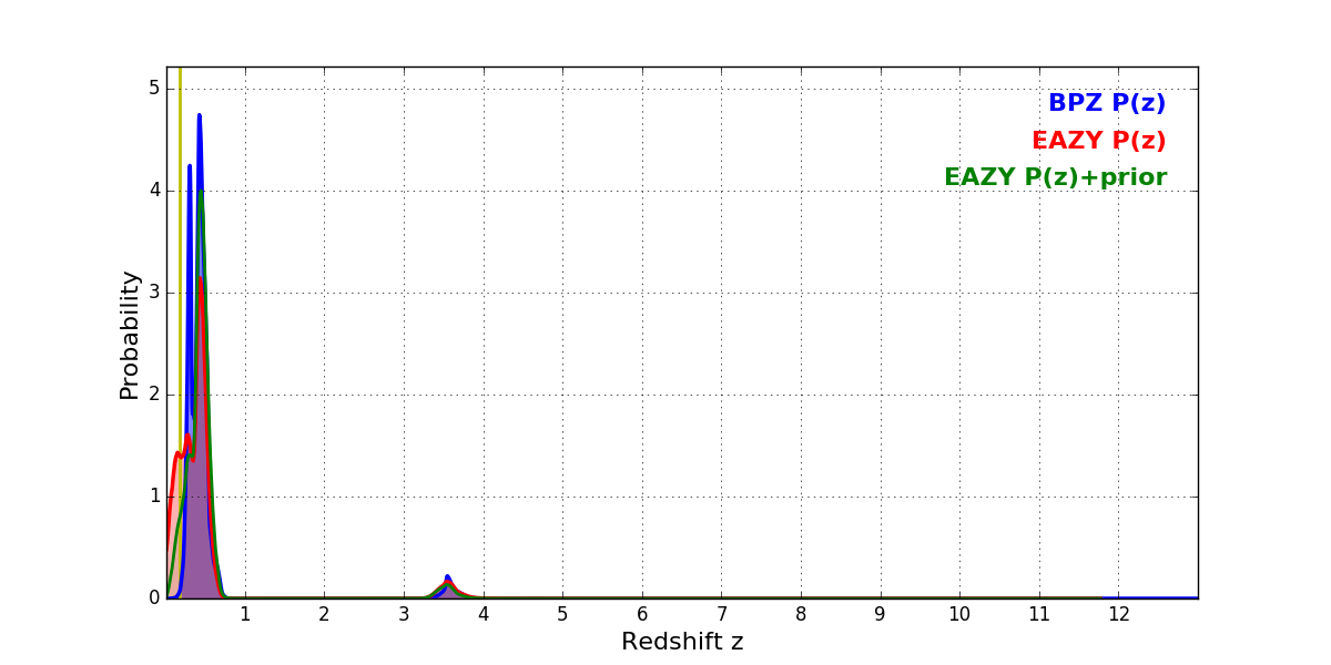 In P(z) plots: Yellow lines mark the cluster redshift z = 0.182,