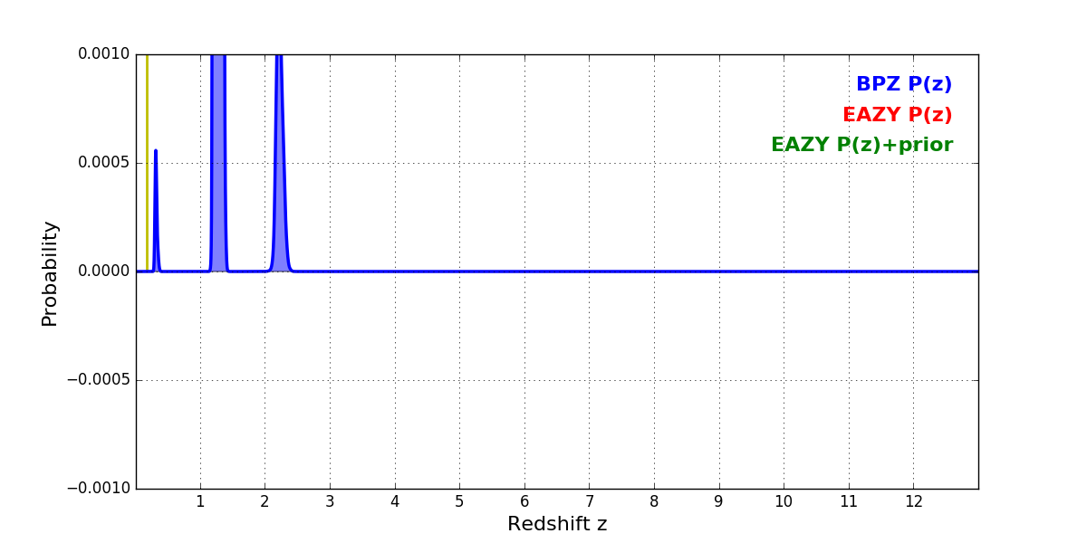 In P(z) plots: Yellow lines mark the cluster redshift z = 0.182,