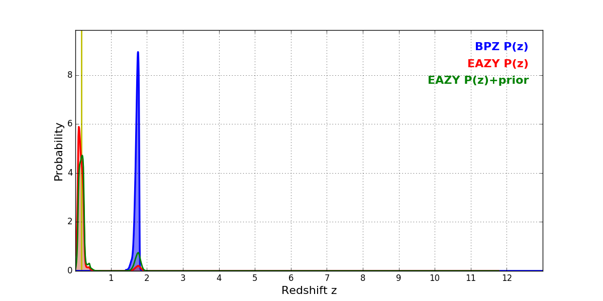 In P(z) plots: Yellow lines mark the cluster redshift z = 0.182,