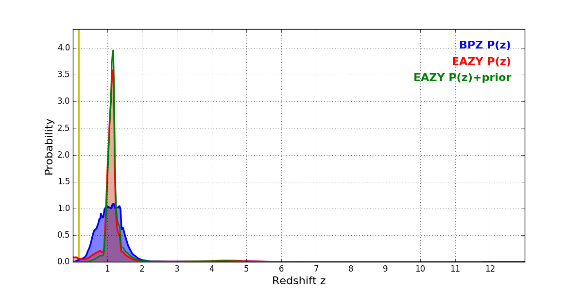 In P(z) plots: Yellow lines mark the cluster redshift z = 0.182,