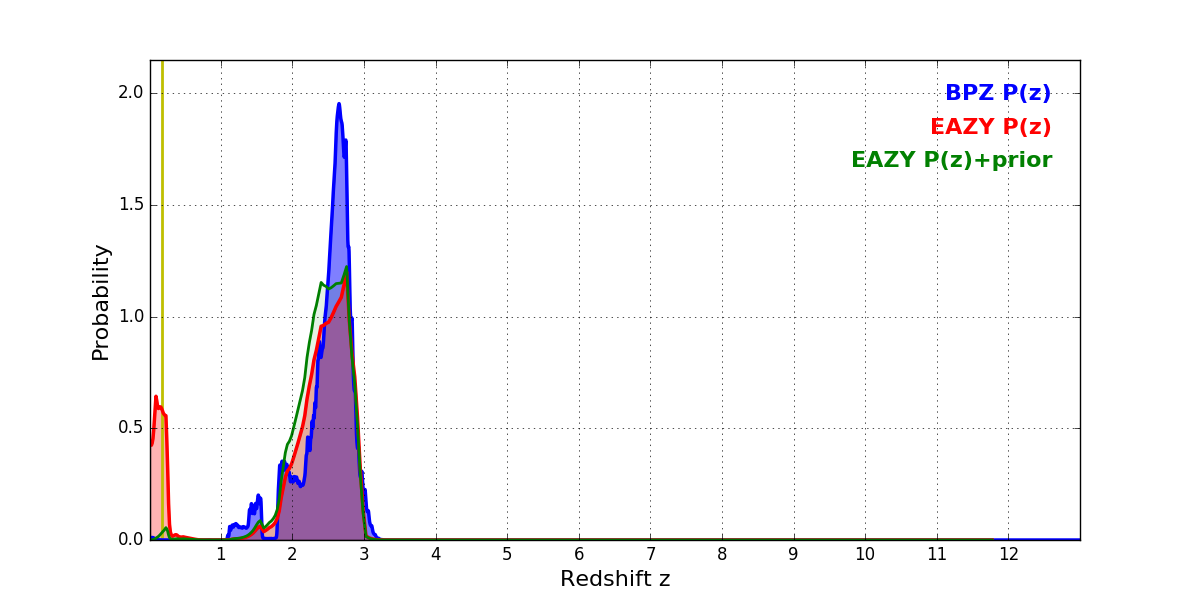 In P(z) plots: Yellow lines mark the cluster redshift z = 0.182,