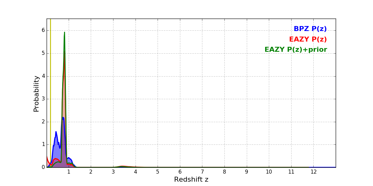 In P(z) plots: Yellow lines mark the cluster redshift z = 0.182,