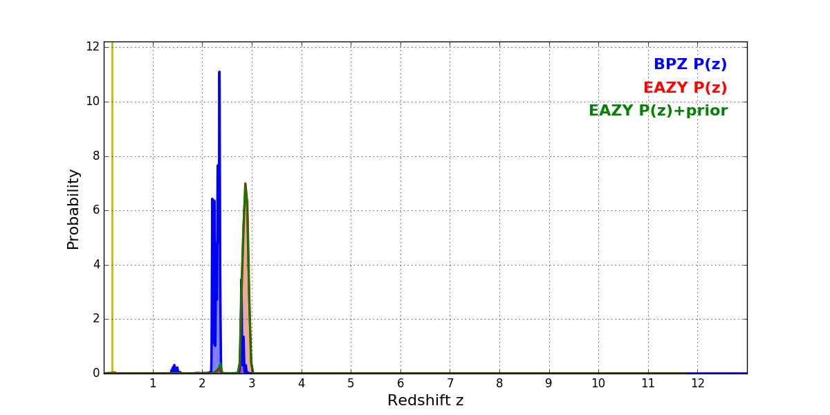 In P(z) plots: Yellow lines mark the cluster redshift z = 0.182,