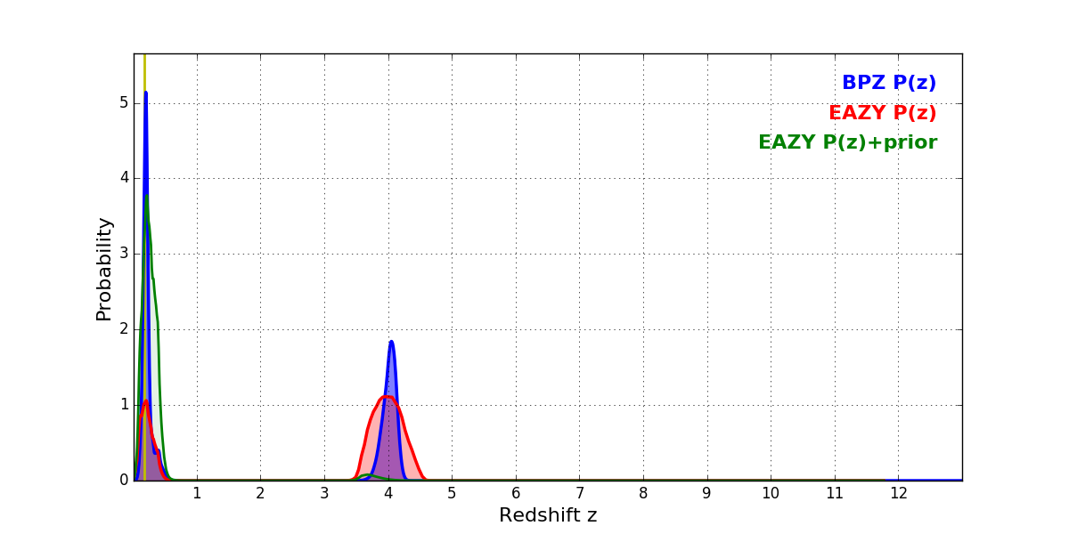 In P(z) plots: Yellow lines mark the cluster redshift z = 0.182,