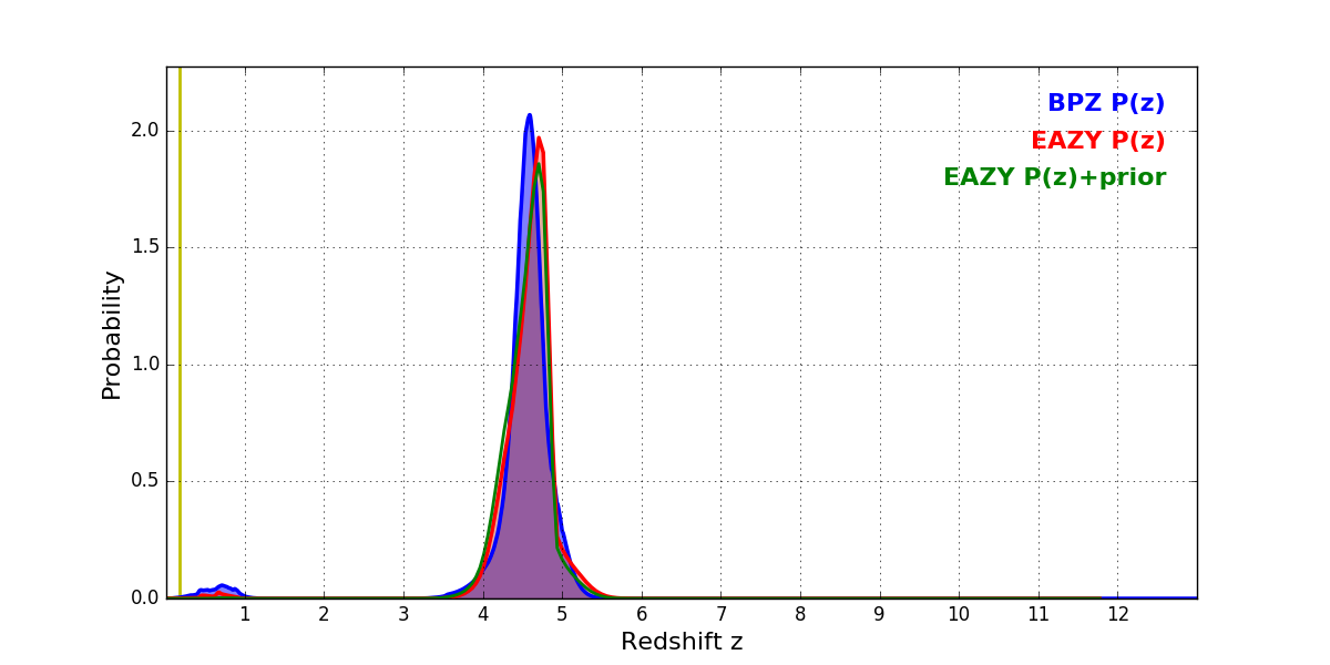 In P(z) plots: Yellow lines mark the cluster redshift z = 0.182,