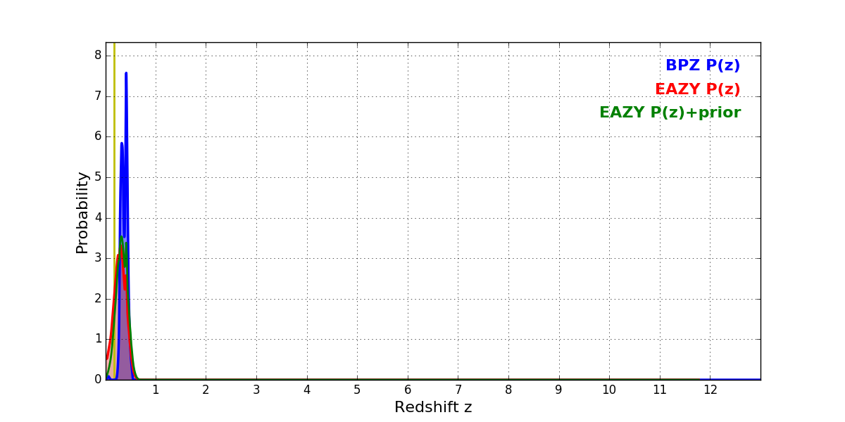In P(z) plots: Yellow lines mark the cluster redshift z = 0.182,