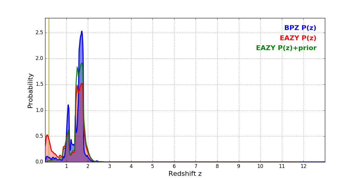 In P(z) plots: Yellow lines mark the cluster redshift z = 0.182,