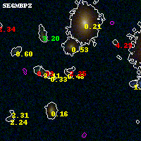 Black segments are analyzed here. Roll mouse over color images to view segments. Best viewed in a wide browser window (1200 pixels or more). Download SED & P(z) plots to view larger versions.