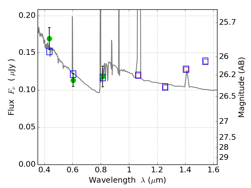 Object #2324   x,y = (797, 2399)   RA, Dec = (08:43:07.704, 36:21:45.36) = (130.78210, 36.36260)   BPZ = 1.143 [0.869--2.337]   type = 11.00 (SB11_A_0_l)   chisq2 = 1.33   ODDS = 0.23   z_cluster = 0.282