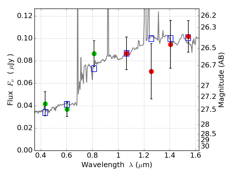 Object #2713   x,y = (2986, 2202)   RA, Dec = (08:42:56.808, 36:21:33.48) = (130.73670, 36.35930)   BPZ = 0.845 [0.373--1.215]   type = 9.20 (SB2_B10 - SB3_B10)   chisq2 = 0.75   ODDS = 0.29   z_cluster = 0.282