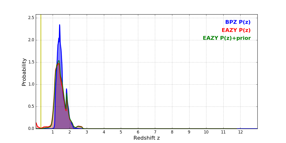 In P(z) plots: Yellow lines mark the cluster redshift z = 0.300,