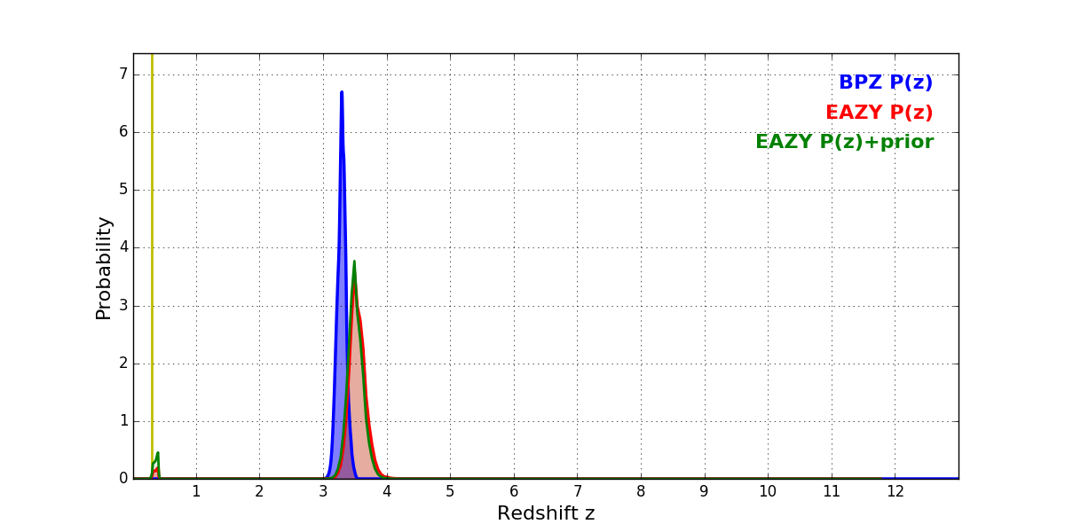 In P(z) plots: Yellow lines mark the cluster redshift z = 0.300,
