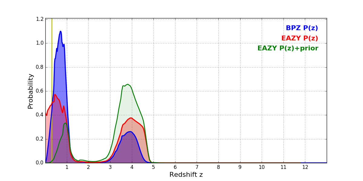 In P(z) plots: Yellow lines mark the cluster redshift z = 0.300,