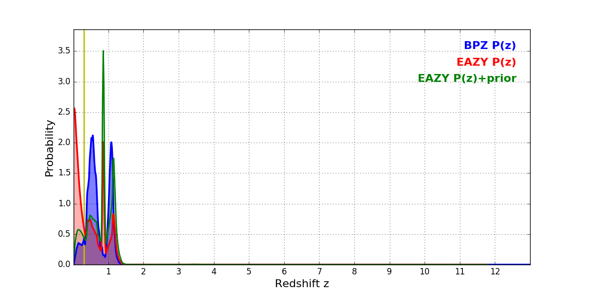 In P(z) plots: Yellow lines mark the cluster redshift z = 0.300,