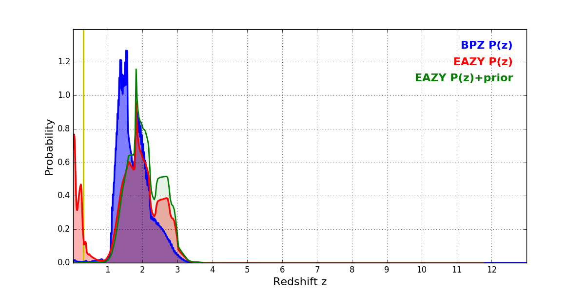 In P(z) plots: Yellow lines mark the cluster redshift z = 0.300,