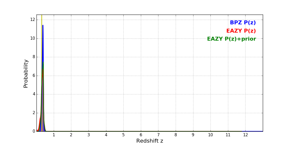 In P(z) plots: Yellow lines mark the cluster redshift z = 0.300,