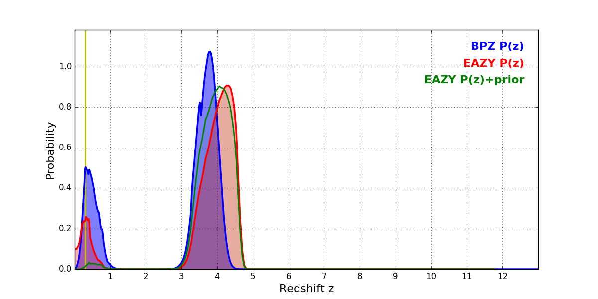 In P(z) plots: Yellow lines mark the cluster redshift z = 0.300,