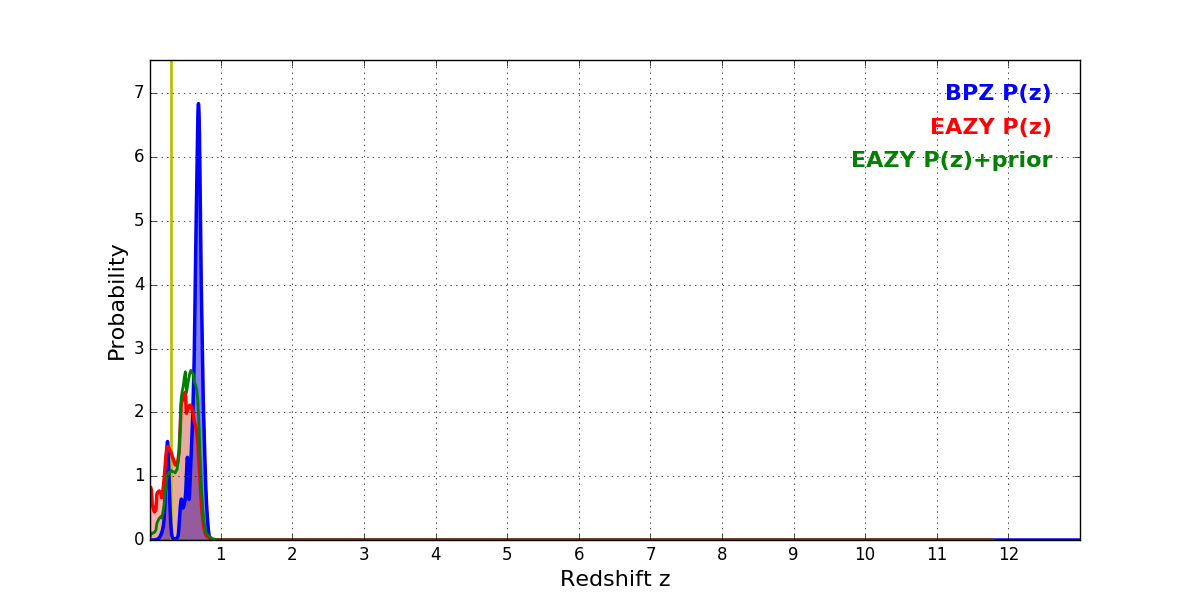 In P(z) plots: Yellow lines mark the cluster redshift z = 0.300,