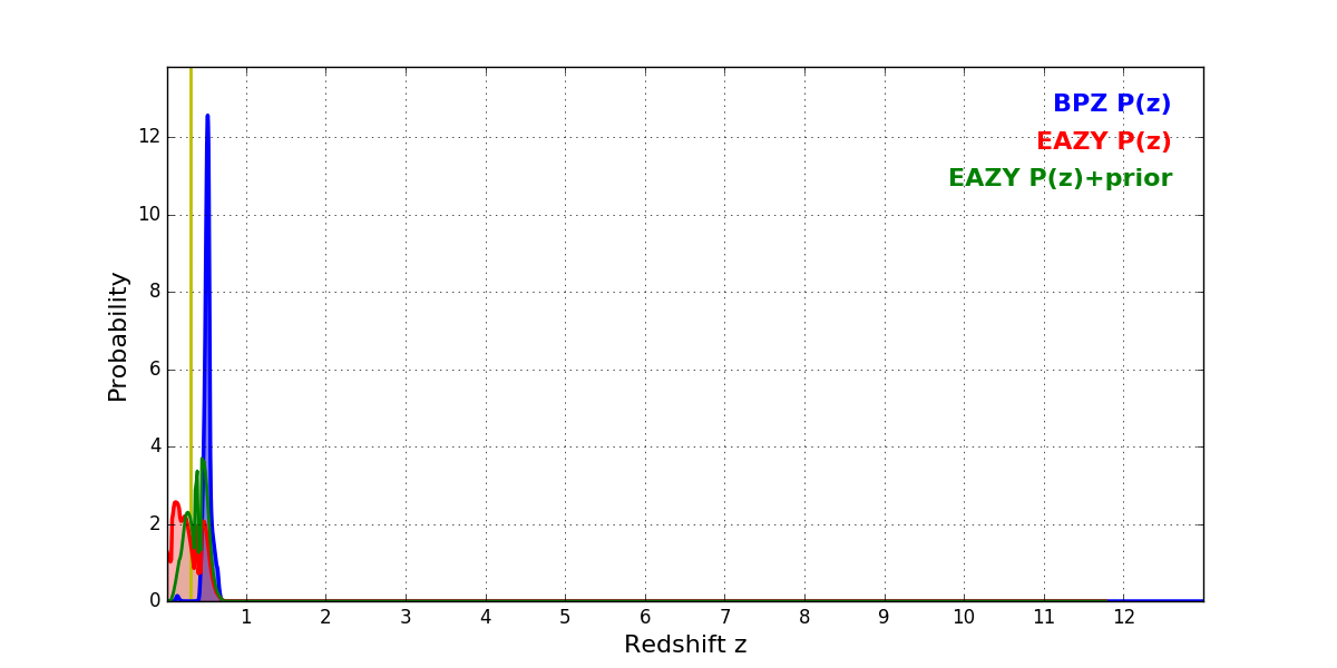 In P(z) plots: Yellow lines mark the cluster redshift z = 0.300,