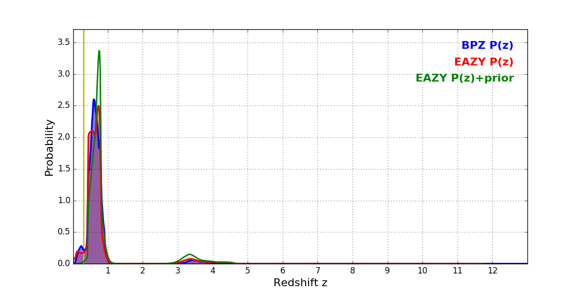 In P(z) plots: Yellow lines mark the cluster redshift z = 0.300,