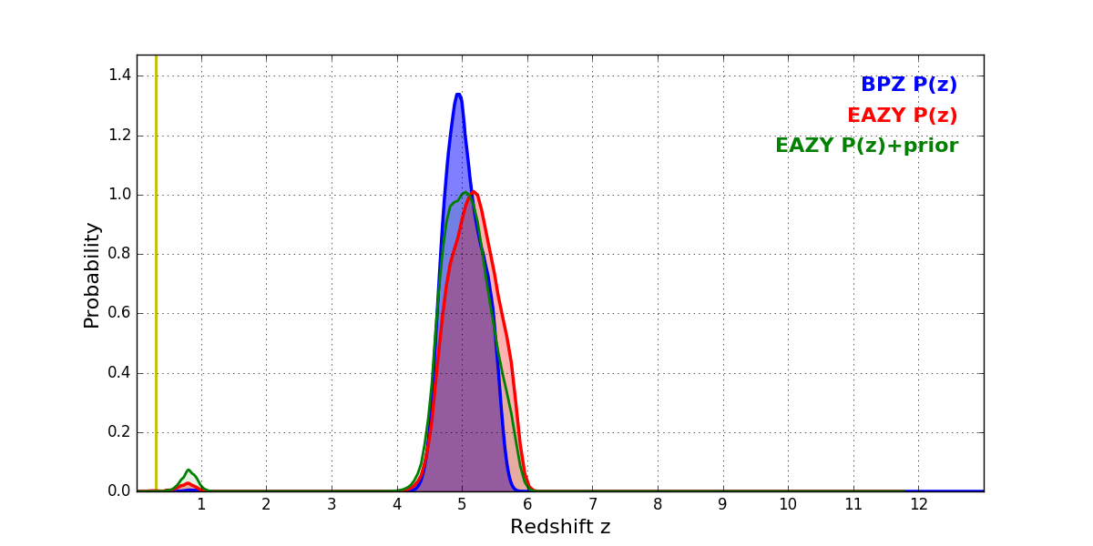 In P(z) plots: Yellow lines mark the cluster redshift z = 0.300,