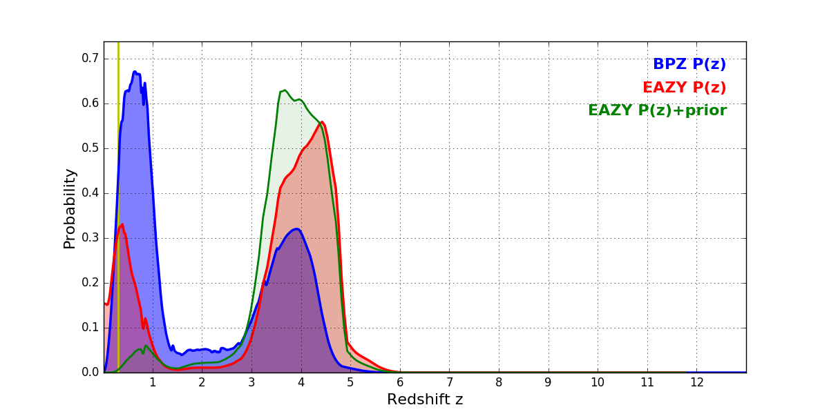 In P(z) plots: Yellow lines mark the cluster redshift z = 0.300,