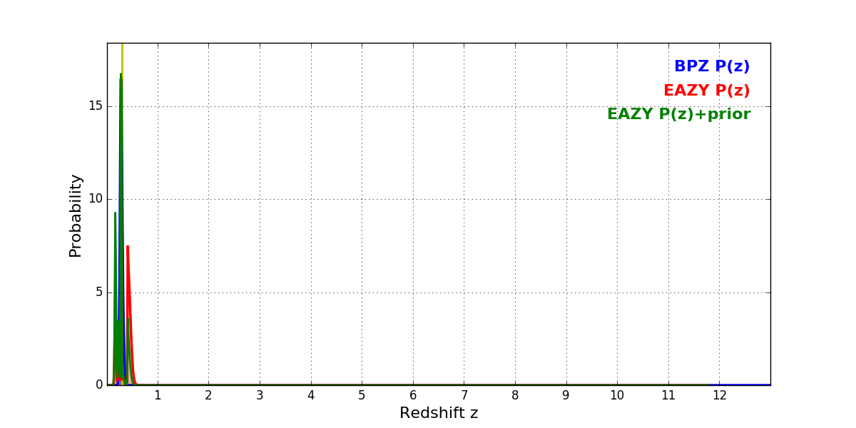 In P(z) plots: Yellow lines mark the cluster redshift z = 0.300,