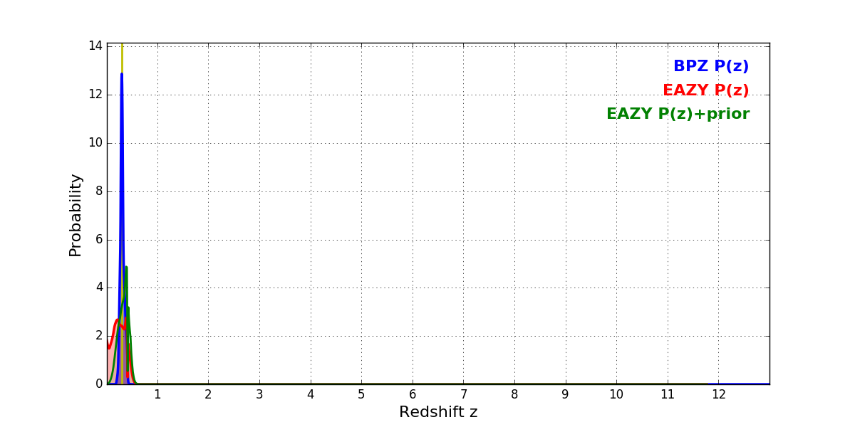 In P(z) plots: Yellow lines mark the cluster redshift z = 0.300,