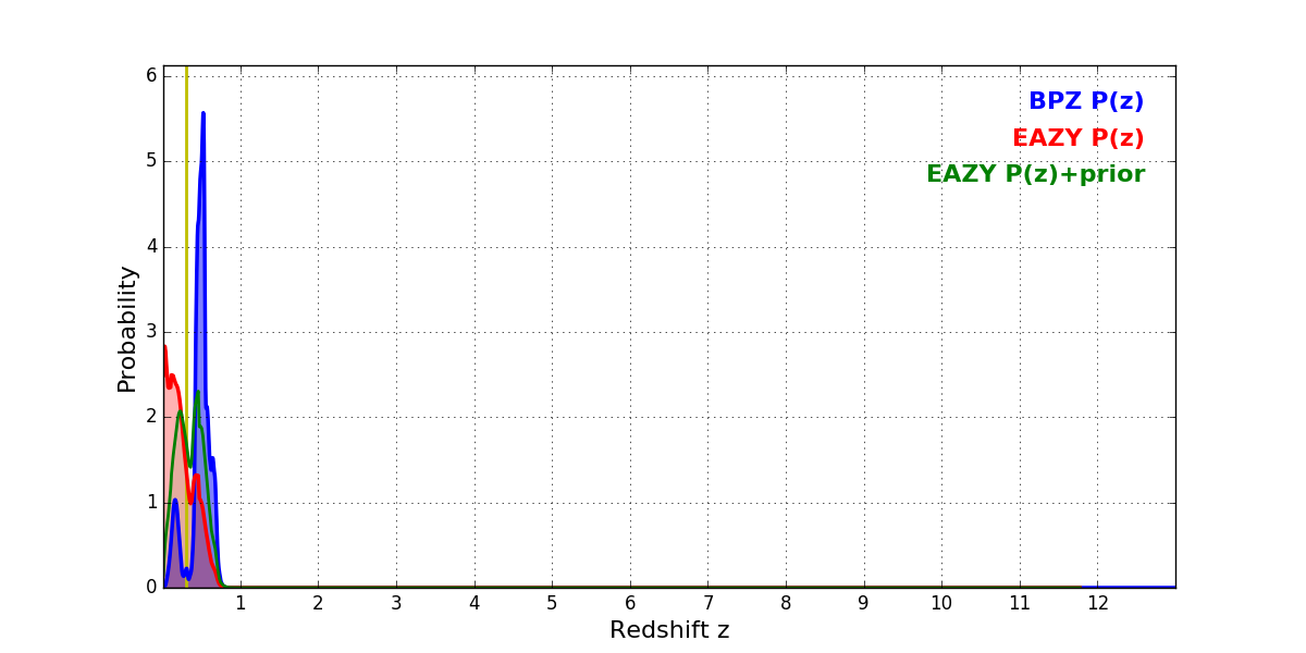 In P(z) plots: Yellow lines mark the cluster redshift z = 0.300,