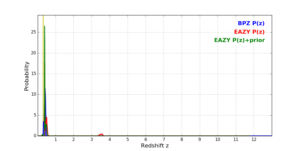 In P(z) plots: Yellow lines mark the cluster redshift z = 0.300,