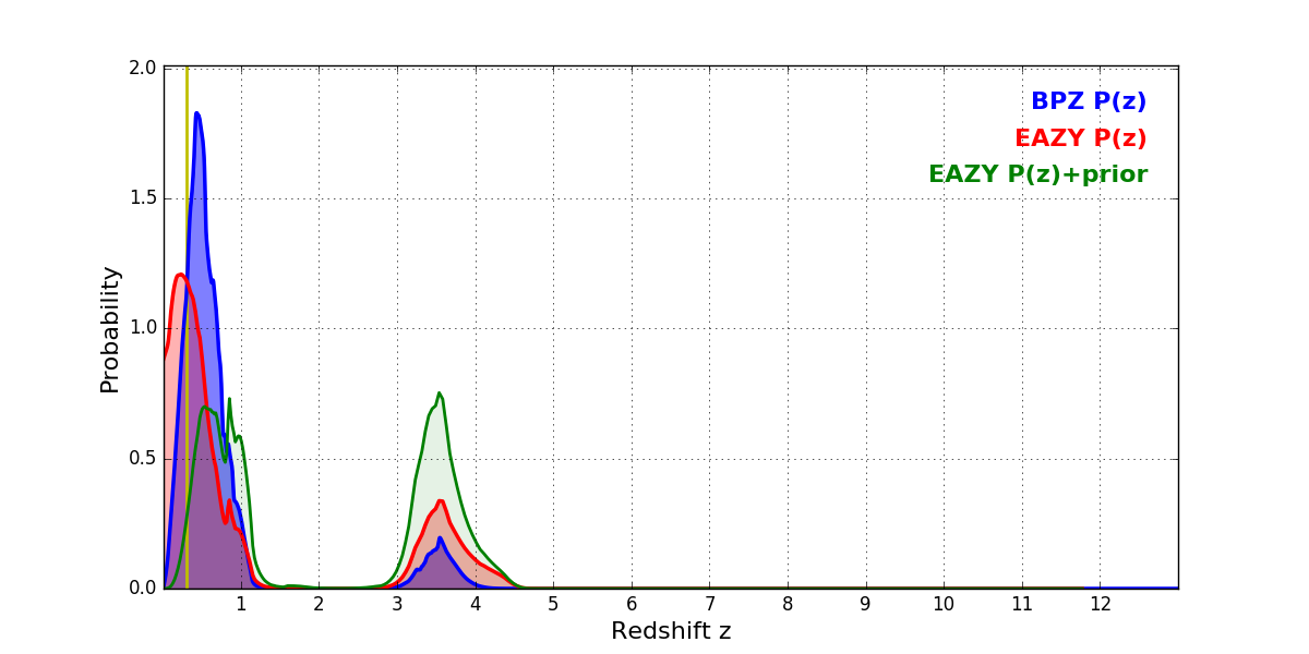 In P(z) plots: Yellow lines mark the cluster redshift z = 0.300,