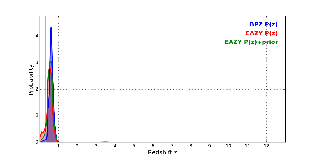 In P(z) plots: Yellow lines mark the cluster redshift z = 0.300,