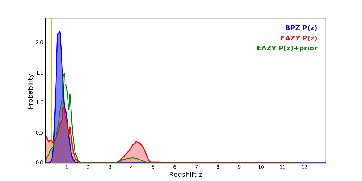 In P(z) plots: Yellow lines mark the cluster redshift z = 0.300,