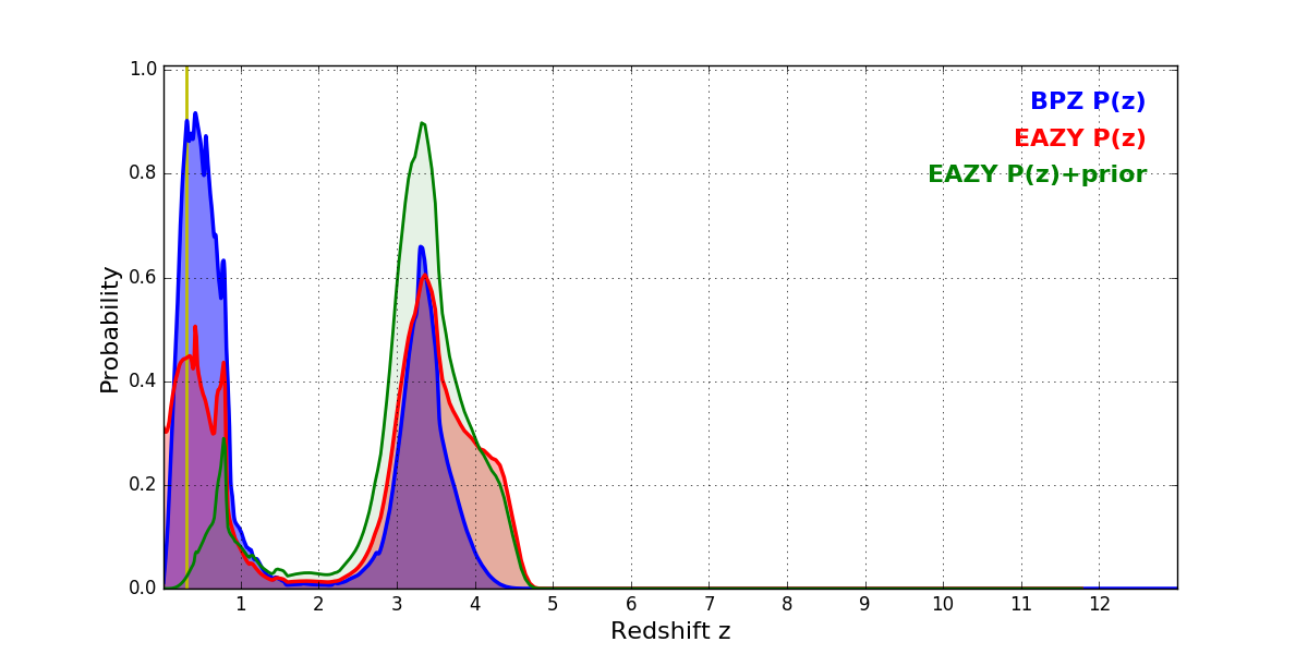 In P(z) plots: Yellow lines mark the cluster redshift z = 0.300,